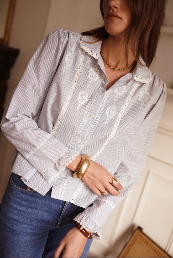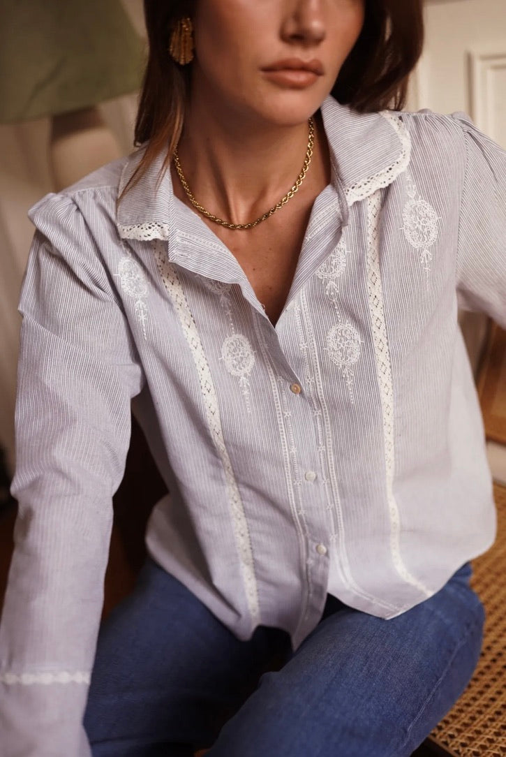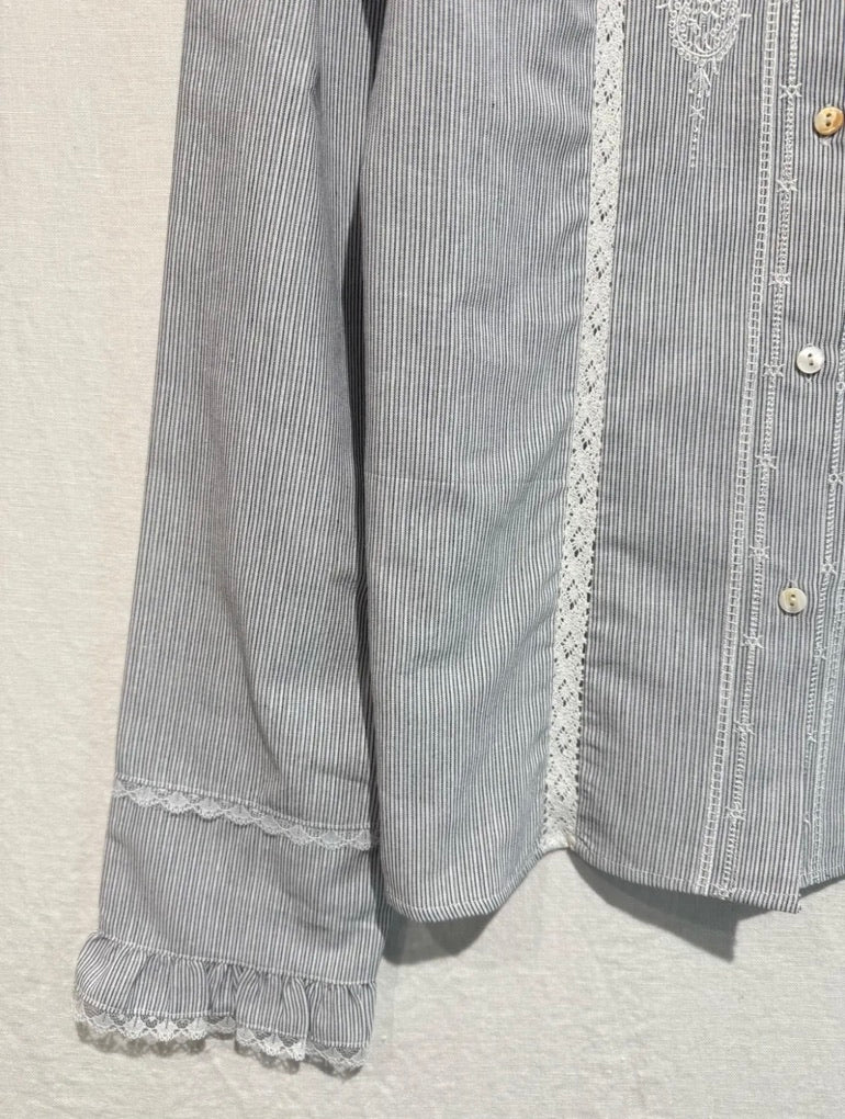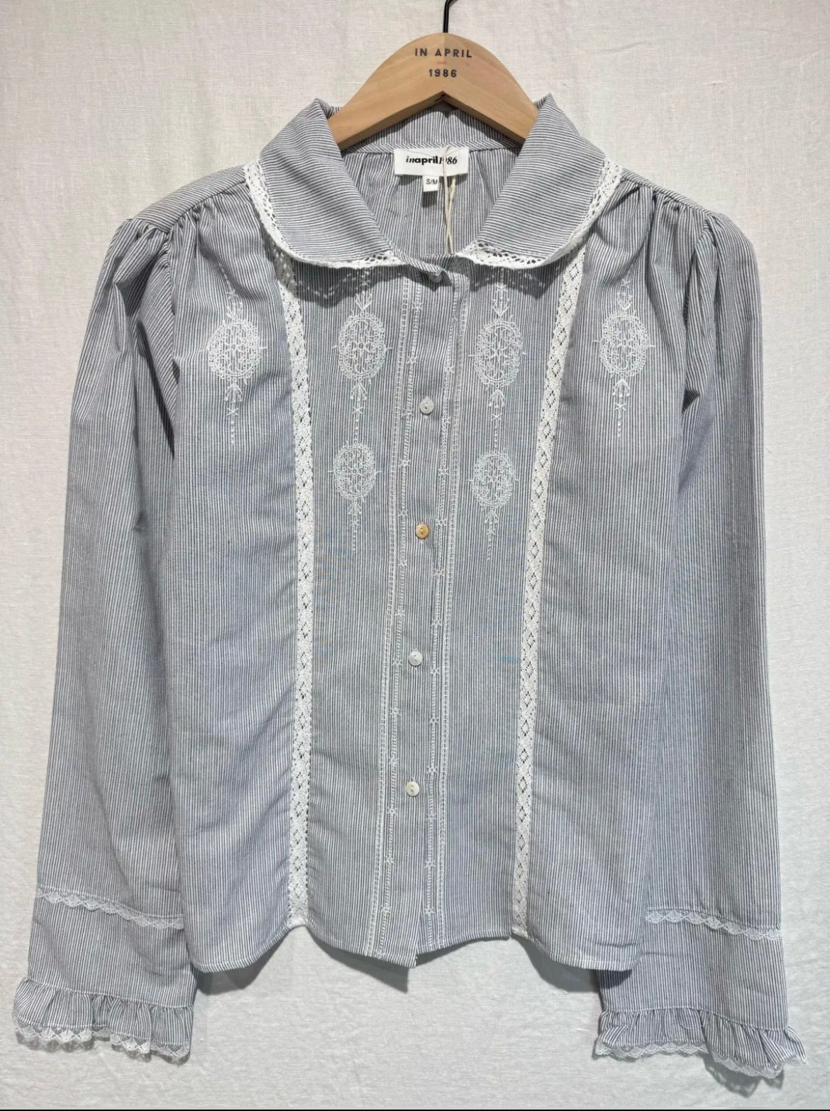 InApril 1986 cotton embroidered shirt in grey pinstripe